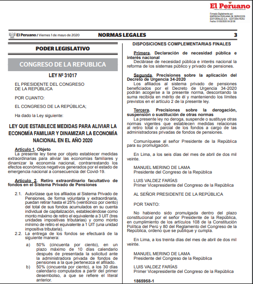 Hoy Vienes 01 de Mayo se publicó en el Diario Oficial EL Peruano la ley que permite a los aportantes realizar el retiro del 25% de su AFP.